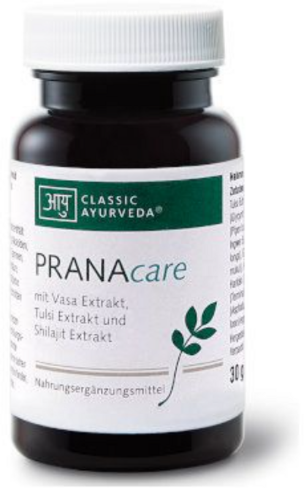 Les gélules PRANAcare de Classic Ayurveda contiennent une composition d'extraits de plantes de haute qualité et d'épices traditionnelles. La recette est basée sur le vasa et le tulsi, combinés à la réglisse, au curcuma et au guggulu. Le mélange est complété par du shilajit ainsi que par les composants du triphala amla, haritaki et bibhitaki et les épices trikatu pippali, poivre noir et gingembre.
